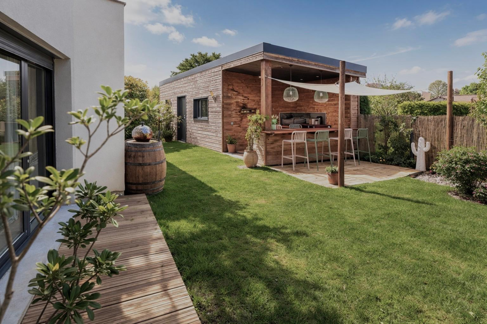 Un joli jardin ensoleillé ainsi que plusieurs stationnements complètent cette jolie maison contemporaine.
