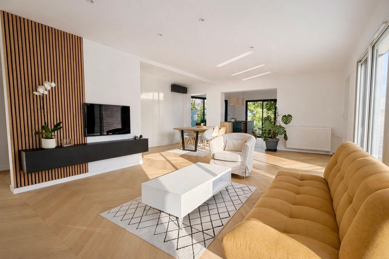 Pièce de vie avec cuisine aménagée et équipée d’environ 60 m2, plancher massif, ouverte sur une terrasse ensoleillée avec piscine chauffée.